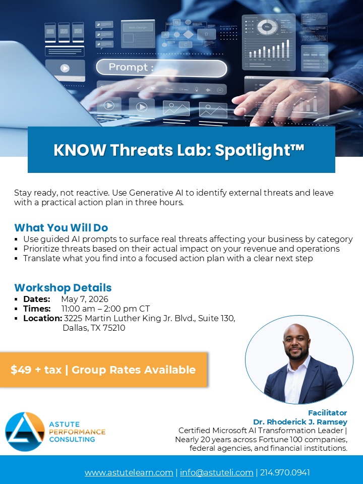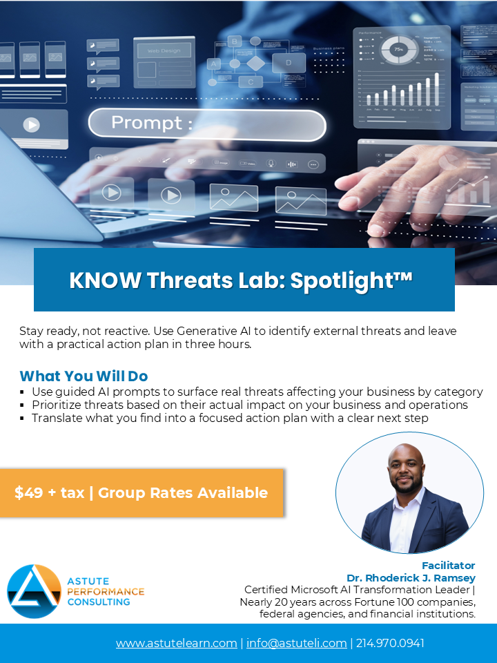 The KNOW Threats Lab: Spotlight™ is a three-hour, in-person working session for business owners, entrepreneurs, and operational leaders. You will use Generative AI to analyze external threats affecting your actual business, right in the room, in real time. No tech background required. You leave with a completed threat analysis, reusable AI prompts, and 90-day actions you can take immediately.