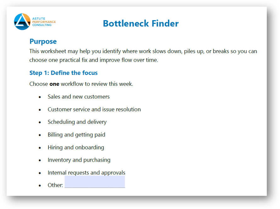 This quick worksheet helps you identify the step in your workflow that may be causing repeat fires, delays, or rework. Use it to pick one improvement to test next.